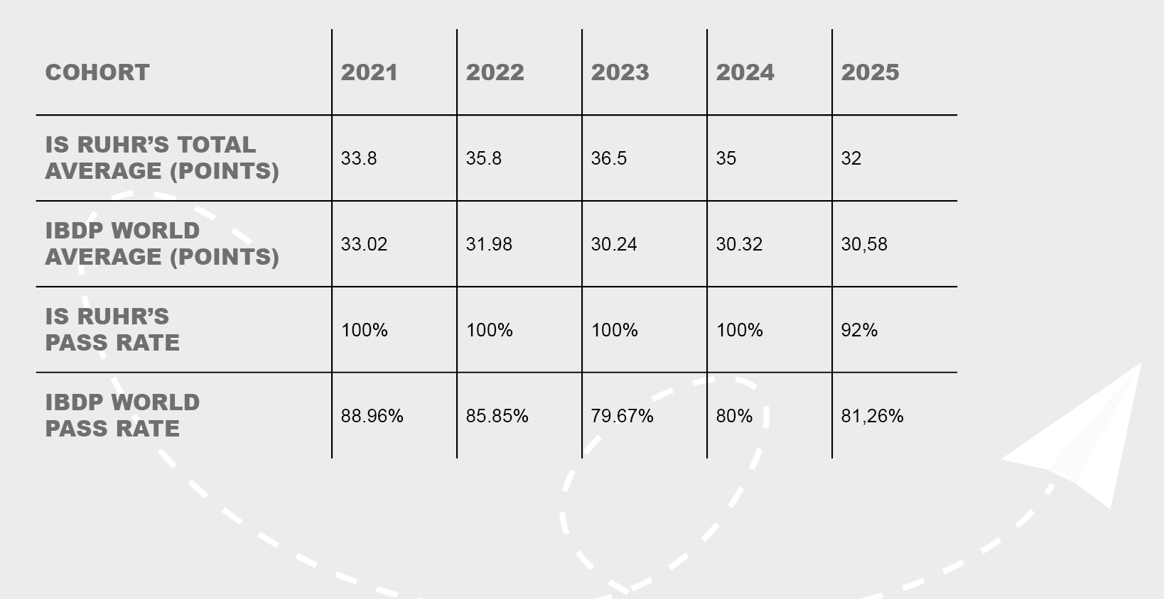 The IB Diploma Programme at IS Ruhr goes beyond academic achievement – it is a world-class preparation for university and a foundation for lifelong success. Our students’ exceptional results reflect their dedication to inquiry-based learning, critical thinking, and personal growth. We are proud to share that our IB Diploma results surpass the world average, demonstrating our commitment to excellence through the hard work of our students and educators alike. These achievements underscore our role in shaping well-rounded, intellectually curious young adults, ready for success at leading universities worldwide.
